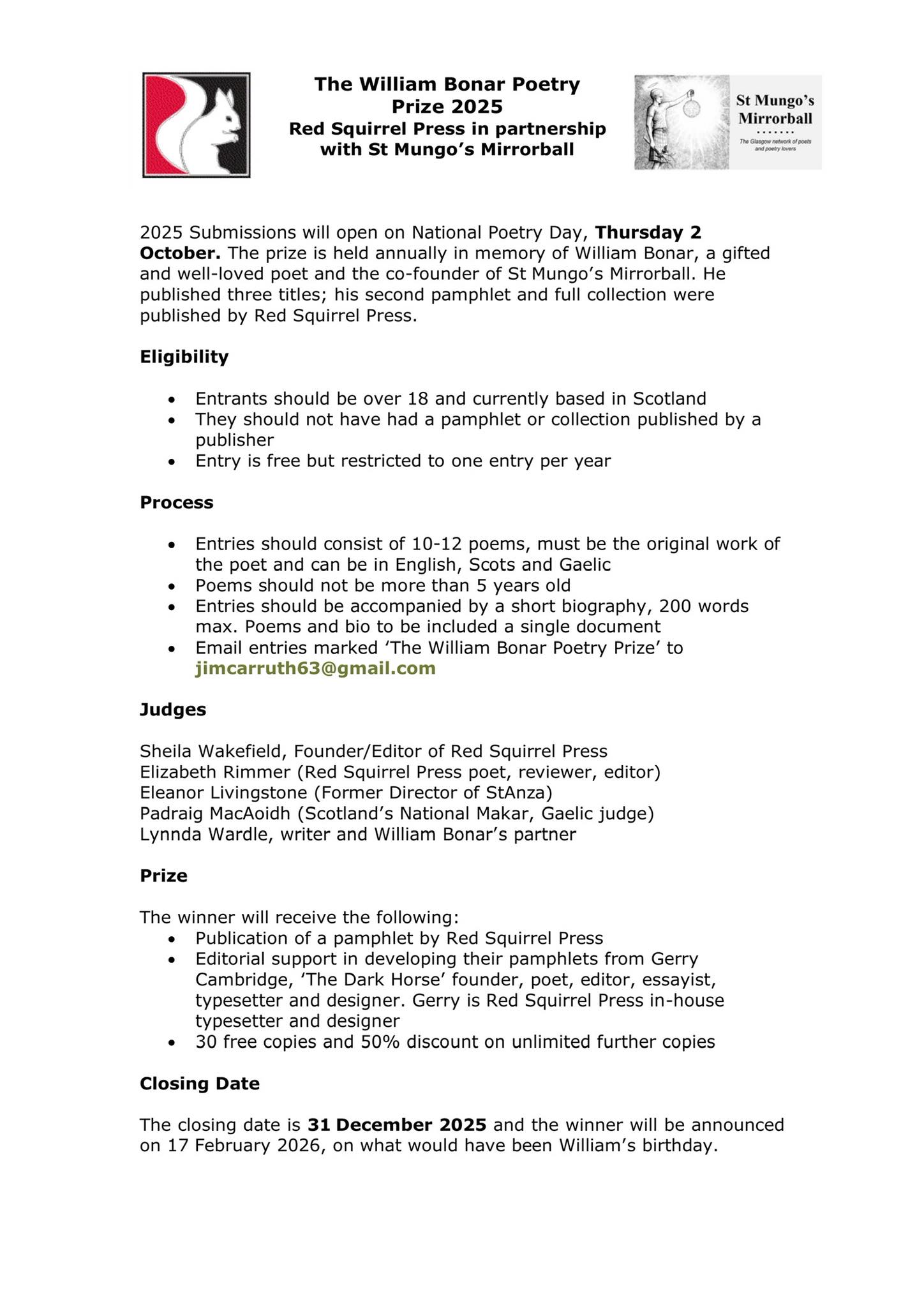 The prize is really worth having. Partial though I may be, Red Squirrel Press publications have a reputation for the highest production values, and I have known poets weep with delight when they first see the design Gerry Cambridge has come up with for their work. (An example, I nearly cried myself when I found the wee wren hiding in the pages of Haggards.) As an editor himself, having produced The Dark Horse poetry magazine for many years, he needs no introduction, and anyone would benefit from his advice in starting a poetry career.